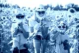 Mom and sons are walking around the field with sunflowers. A happy day.