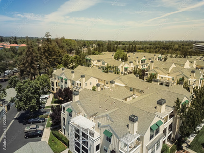 Aerial view typical multi-level apartment complex in Cupertino, Silicon Valley, California, cloud blue sky