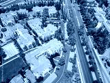 Aerial view typical multi-level apartment homes with swimming pool near freeway in Silicon Valley, California
