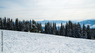Bukovel in the winter. Snow-capped mountain peaks. Ukrainian Carpathians.Mount Hoverla
