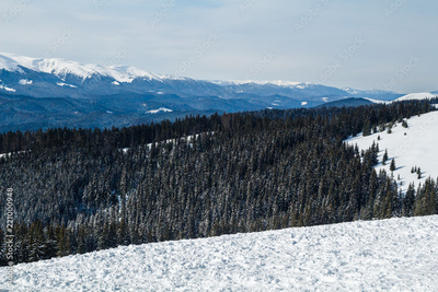 Bukovel in the winter. Snow-capped mountain peaks. Ukrainian Carpathians.Mount Hoverla