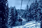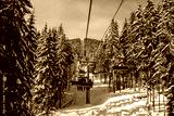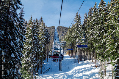 Skiers and snowboarders on a ski lift.view from above on the cable car among the winter forest.