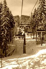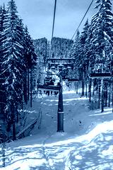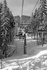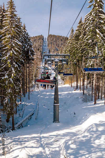 Skiers and snowboarders on a ski lift.view from above on the cable car among the winter forest.