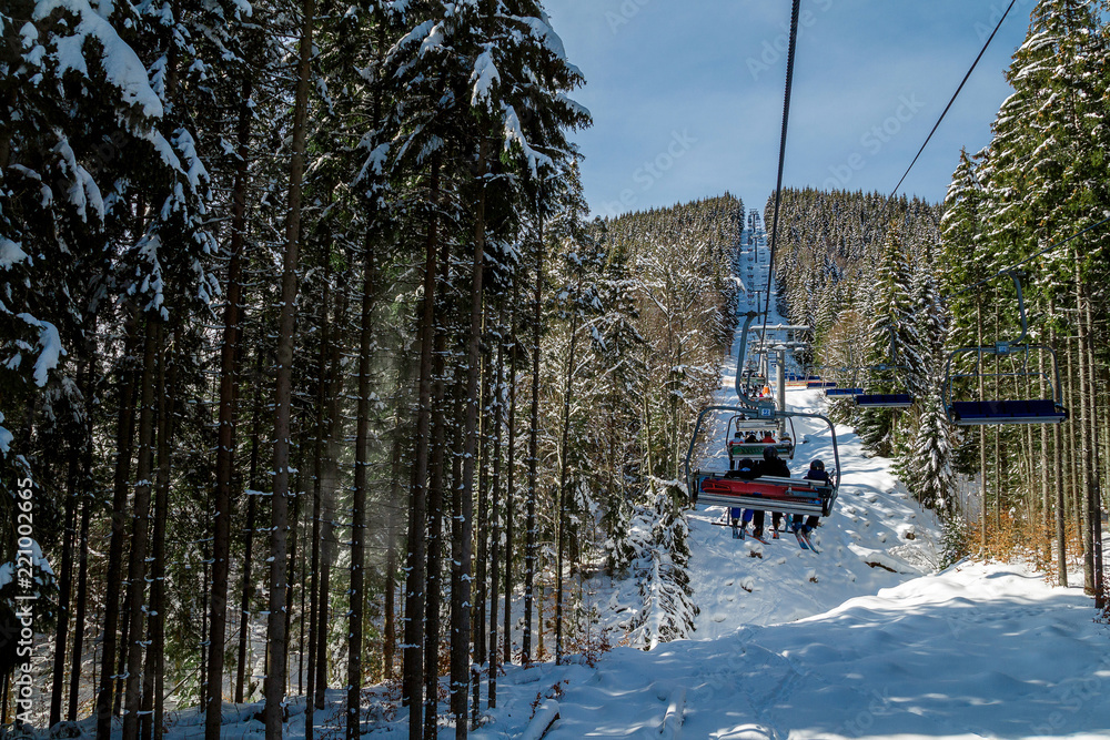 Skiers and snowboarders on a ski lift.view from above on the cable car among the winter forest.