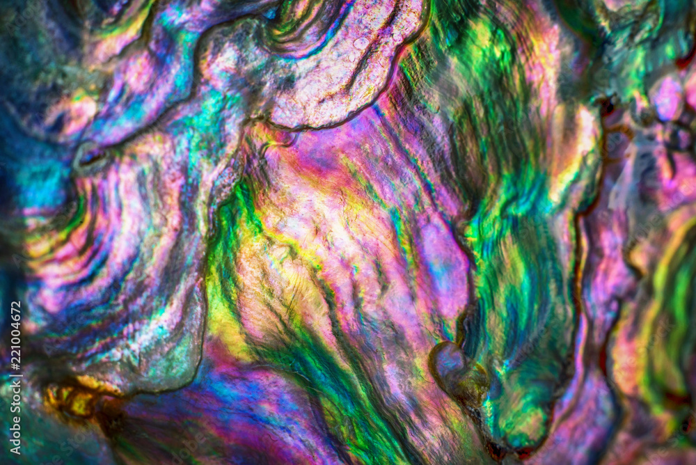 High magnification macro of nature texture pearl shell. Rainbow colors abstract background close-up.
