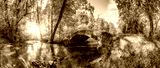 Old bridge over a creek in the forest with bright sun shining throug the trees