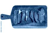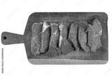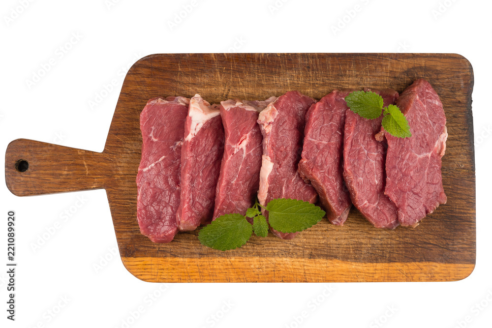 Raw beef pieces and slices on wooden cutting board isolated on white background.