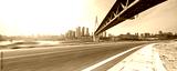 empty asphalt highway through modern city