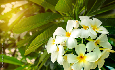 Frangipani flower (Plumeria alba) with green leaves on blurred background. White flowers with yellow at center. Health and spa background. Summer spa concept. Relax emotion.