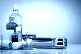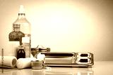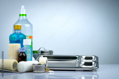Wound care dressing set and stainless steel plate, forceps, iodine cup, conform bandage, elastic cohesive retention bandage, antiseptic and normal saline bottle, instruments container. Medical supply.