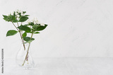 Gentle minimalist bouquet in exquisite transparent vase with white small flowers and green leaves on white shelf, simple home decor.