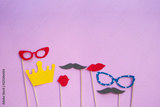 Colorful photo booth props glasses, lips, crown and moustaches on pink background with copyspace.