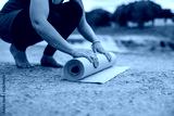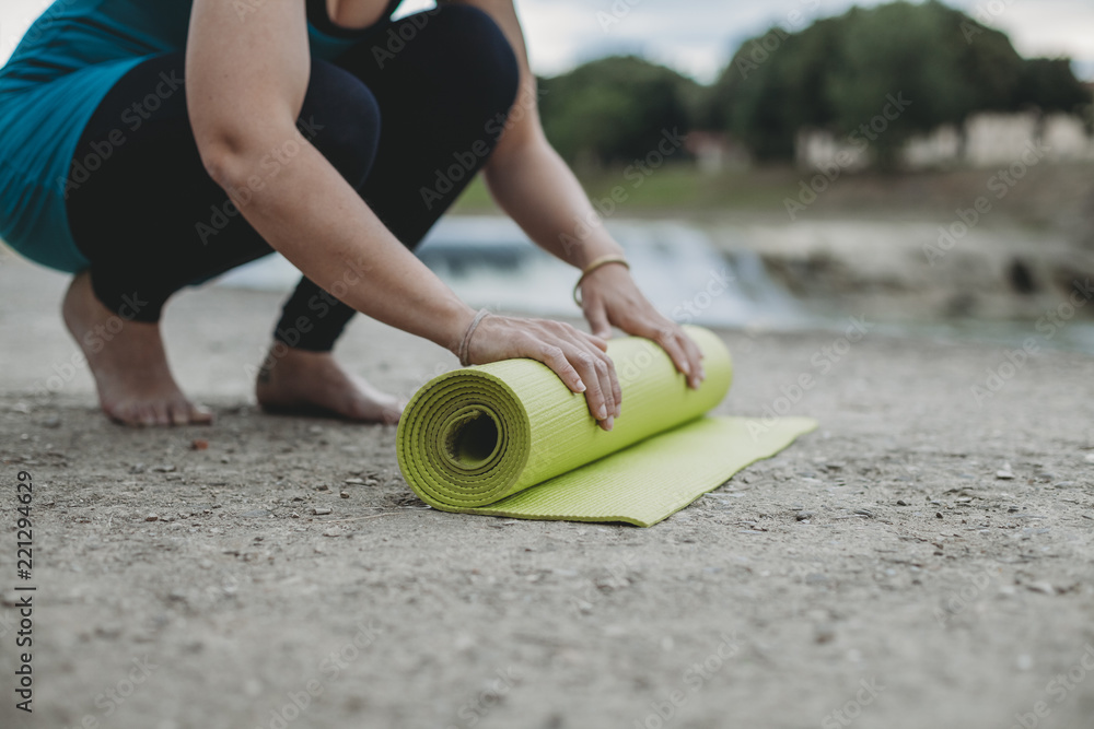 Young beautiful woman arranges mat on the ground to do yoga exercises in summer near the river