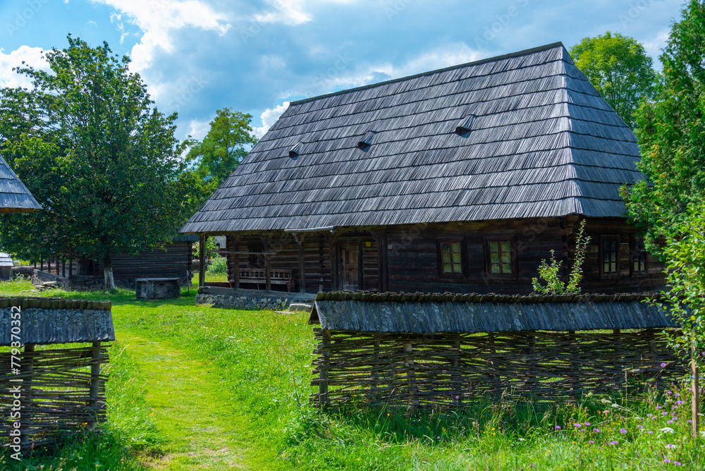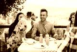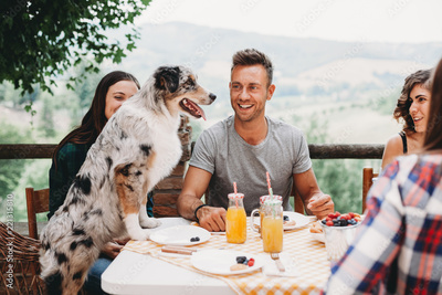 Group of young friends during breakfast in the countryside on a summer day. On the table biscuits, tart and fruit juices in glass bottles. A dog interacts with the millennials sitting at the table
