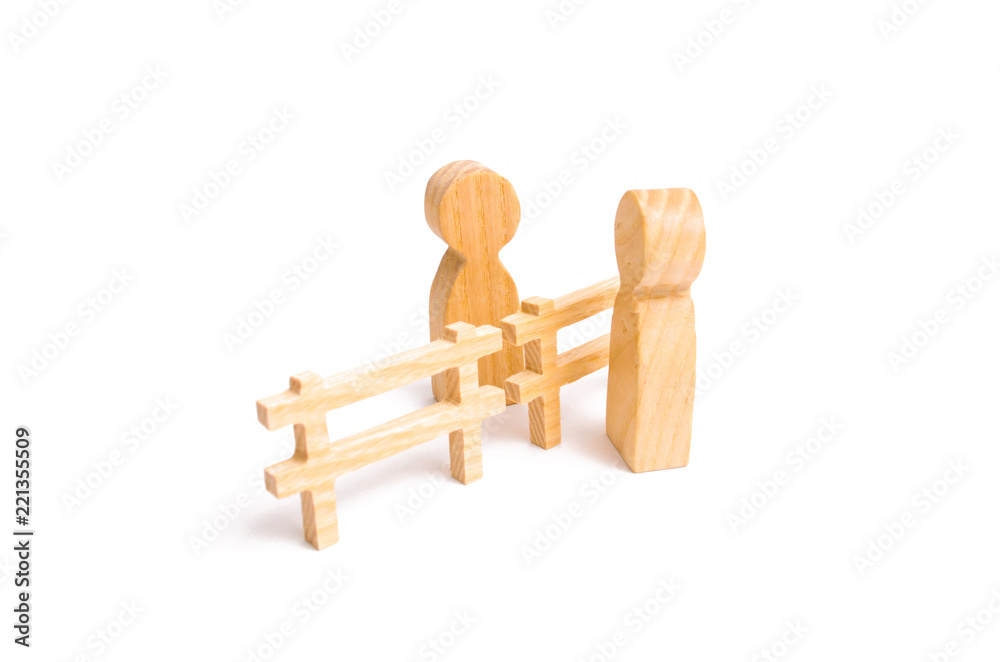 A wooden red chart arrow down divides the two people discussing the case. Termination and breakdown of relations, breaking ties. Contract break, conflict of interests. Negotiations of businessmen.