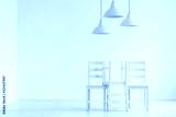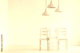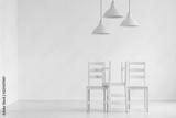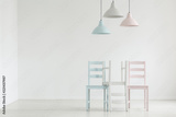 Lamps above pastel chairs in white empty living room interior with copy space on the wall. Real photo