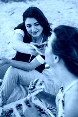 Young couple in love eat pizza on the deserted beach on a summer evening