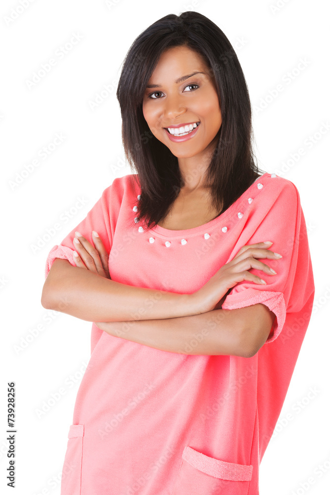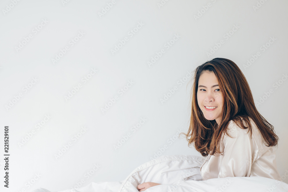 Happy Asian woman sitting on the bed in bedroom and looking to the camera with isolated white background
