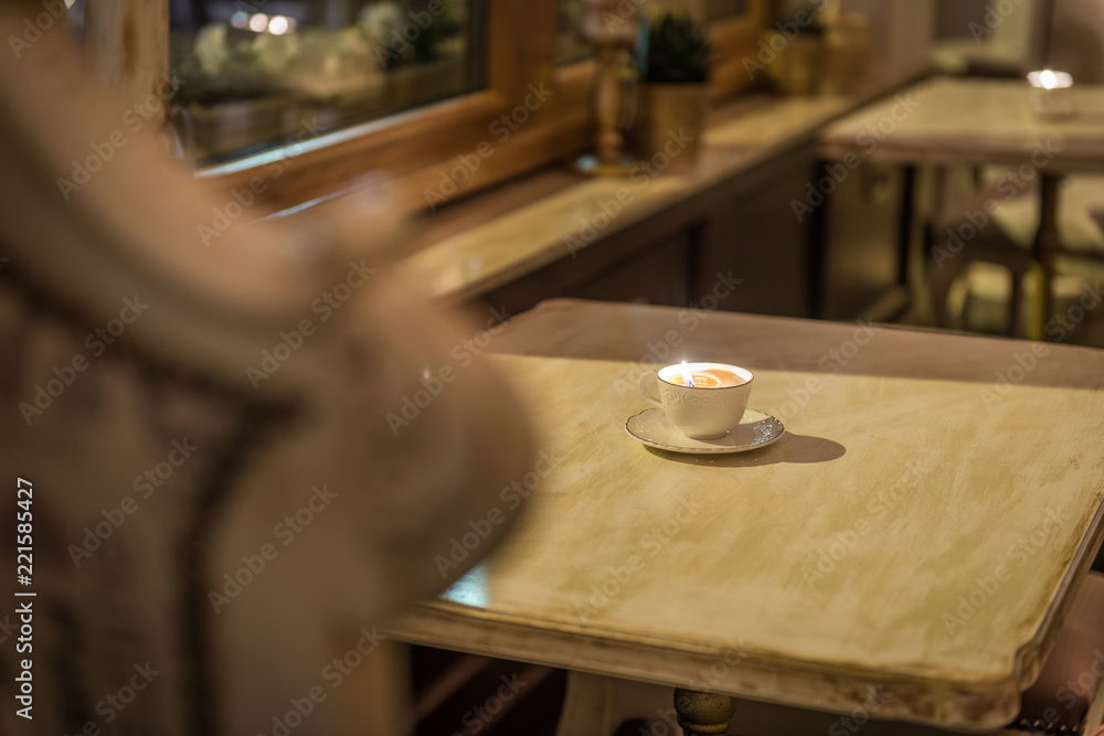 Candle in coffee cup as decoration in restaurant