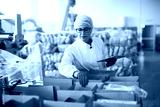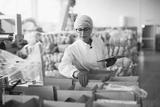 Young female employee in sterile clothes is checking packages ready to be delivered.