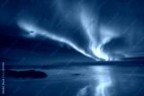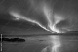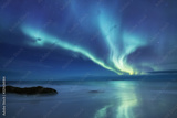 Aurora borealis on the Lofoten islands, Norway. Green northern lights above ocean. Night sky with polar lights. Night winter landscape with aurora and reflection on the water surface.