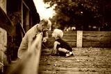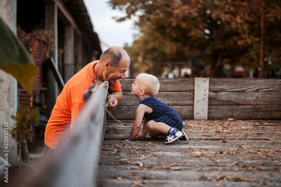 Cute small boy is helping his grandfather to fix the wooden floor in trailer. Love spending time together.