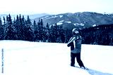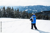 Young handsome man in winter sportswear looking away, wearing big mirrored ski mask