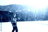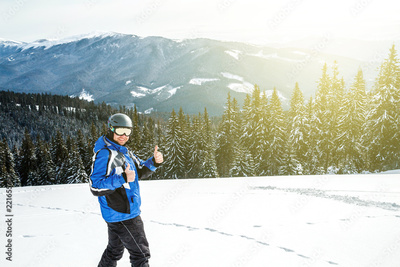 Young handsome man in winter sportswear looking away, wearing big mirrored ski mask