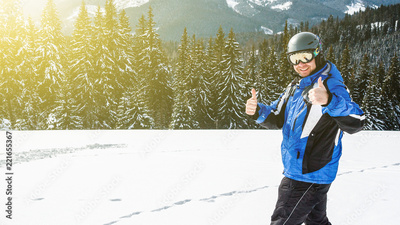 Young handsome man in winter sportswear looking away, wearing big mirrored ski mask