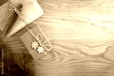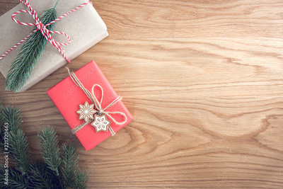 Christmas gift box and tree branch decor on wooden table. Flat lay, Top view with copy space