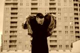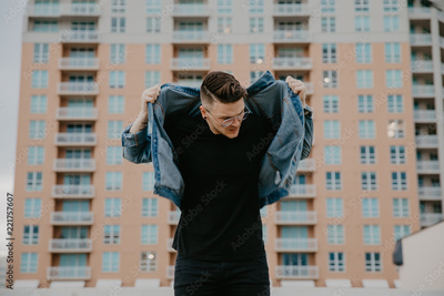 Young Trendy Male Fashion Model in Denim Jacket on Top of a Downtown Parking Garage