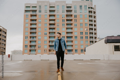 Young Trendy Male Fashion Model in Denim Jacket on Top of a Downtown Parking Garage
