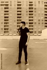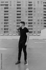 Young Trendy Male Fashion Model in Denim Jacket on Top of a Downtown Parking Garage