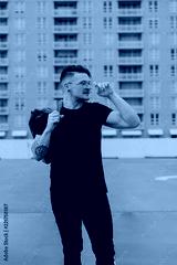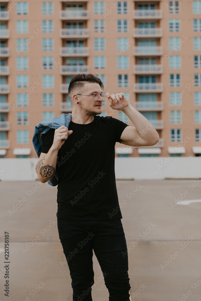 Young Trendy Male Fashion Model in Denim Jacket on Top of a Downtown Parking Garage