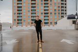 Young Trendy Male Fashion Model in Denim Jacket on Top of a Downtown Parking Garage