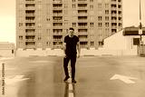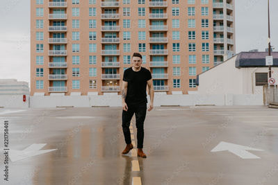 Young Trendy Male Fashion Model in Denim Jacket on Top of a Downtown Parking Garage