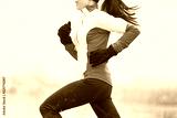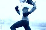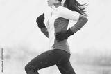 Winter running woman runner jogging in cold weather activewear clothing. Sport exercise person training cardio outdoors in snow.