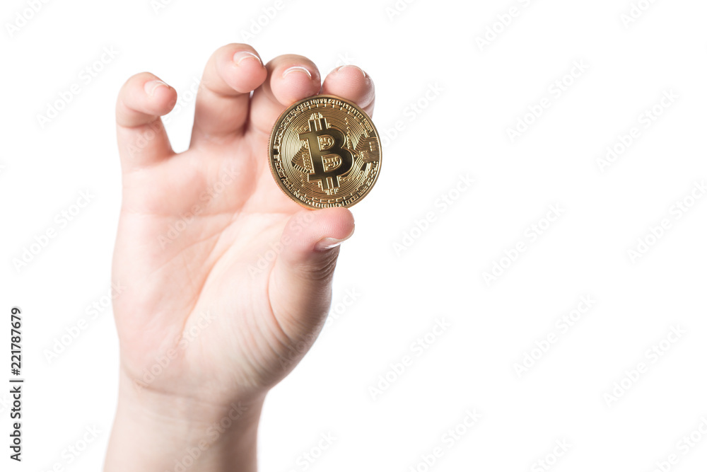 Female hand holding bitcoin symbol of crypto currency electronic virtual money for web banking and international network payment. Isolated on white