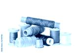 Collection of color thread spools with thimble isolated on white background. Sewing concept.