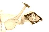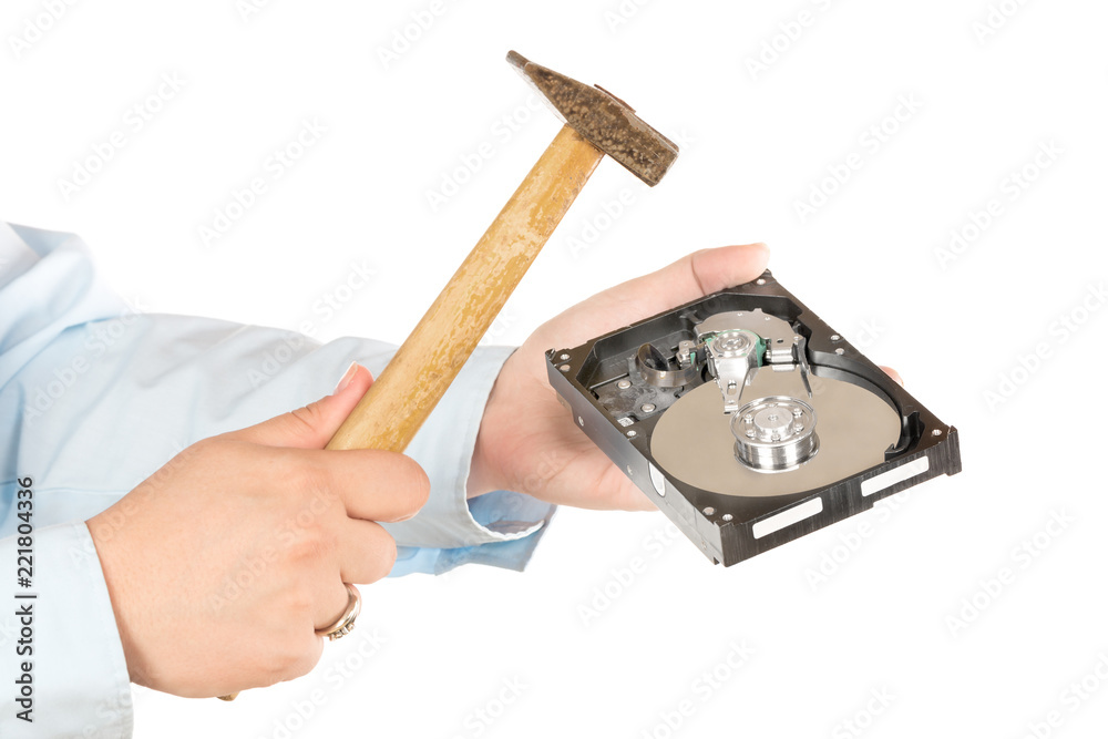 Destroying data concept. Breaking hard disk drive with a hammer. isolated on white background.