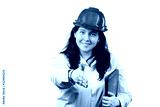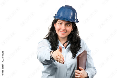 Young attractive brunette woman engineer or architect with blue safety hat pulling hand for handshake isolated on white background