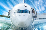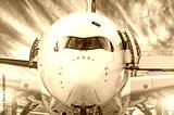 Closeup front view of nose of the passenger airplane and the cockpit glasses of the pilot.