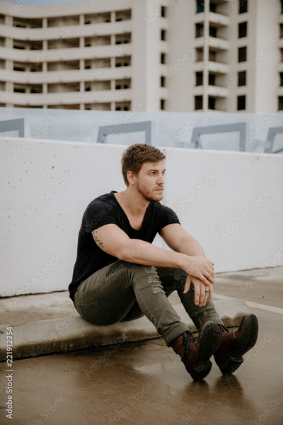 Young Fit Trendy Guy Modeling on Top of Downtown Parking Garage