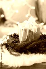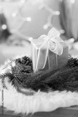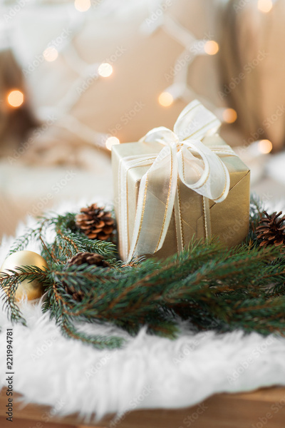 christmas, holidays and decorations concept - christmas gift and fir wreath with cones and balls at home on sheepskin