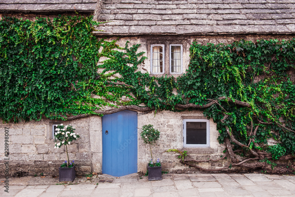 Part of exterior of old house of light brick with tiled roof and low blue door. The facade of the house are entwined with green ivy and hedges. Selective focus, copy space.
