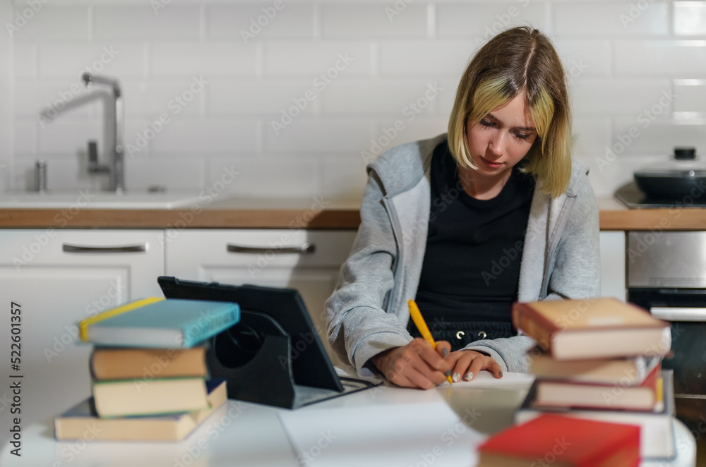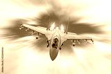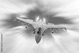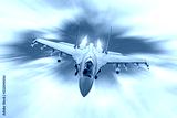 Combat fighter jet on a military mission with weapons - rockets, bombs, weapons on wings, at high speed with fire afterburner engine nozzles, flies in clouds motion blur.