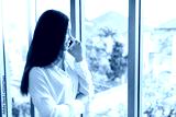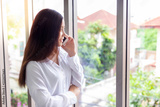 Attractive beautiful woman is calling to her family from overseas or foreign country by using mobile phone. Charming beautiful young woman gets happy when she talk to her family. She stand near window