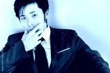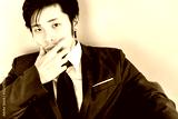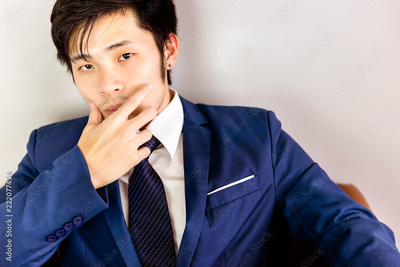 Portrait charming handsome young businessman. Attractive handsome guy look confident. Glamour man sits on sofa and feel relaxed. He wear suit, necktie. Asia businessman get successful of business