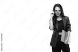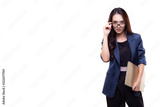 Portrait charming beautiful businesswoman or secretary. Attractive beautiful woman hold laptop and wear suit, eyes glasses or spectacles. Gorgeous girl look confident, determined. isolated background