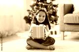 christmas, holidays and childhood concept - happy girl with gift box at home